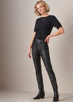 Vegan leather jean style pants with multiple pockets, slim fit gives a long lean silhouette, great stretch, high waisted. Available in Black. 70% Cotton, 20% Polyester, 8% Viscose, 2% Elastane. Average model height approx. 5ft 9in, pant inseam length approx. is 28 inches.