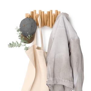 Transform any room in your home with the Umbra Picket Wall Hook, a stylish and functional addition that doubles as a piece of art. Crafted from beautifully beveled pine wood, Picket's unique design adds a sophisticated touch to your decor. Featuring five flip-down hooks, each capable of holding up to 5 lbs, Picket seamlessly blends utility with elegance. When not in use, the hooks flip back up, maintaining a sleek, art-like appearance. Create an eye-catching display by arranging multiple Pickets side by side. Installation is a breeze with all necessary mounting hardware and easy-to-follow instructions included. Whether you're organizing coats and bags in the entryway or displaying jewelry and accessories in the bedroom, the Umbra Picket Wall Hook is the perfect solution. Measuring 14.88 x 6.63 x 1.63 inches (38 x 17 x 4 cm), each Picket showcases the natural variations in tone, texture, and grain of the wood, ensuring a unique and personalized look for your space. The product may vary from our imagery. For Best Care: Wipe with a clean damp cloth