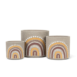 Bring a bohemian, folksy vibe to your favourite flowers or plant with this Large Boho Rainbow Planter. Crafted out of cement, this circular textured grey planter features a New Mexico folk-art style rainbow that makes a charming complement to any type of decor. Also available in smaller sizes.