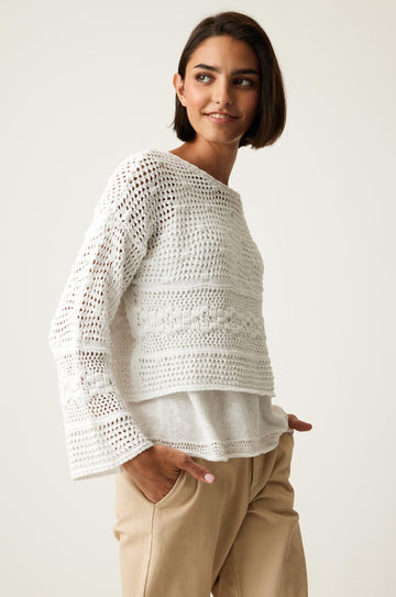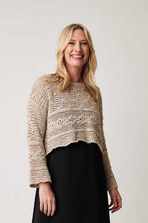 A lightweight, loose-fitting short top with a crochet look. Pretty design patterns and wide cuffs. Pop this over our Eco Tank (70182) for a finished look!
