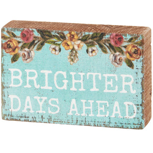 A wooden block sign displaying spring flowers above an inspirational sentiment on spring blue background that reads ""Brighter Days Ahead."" Our Brighter Days Ahead block sign is easy to hang via predrilled keyhole slot or can free-stand alone.