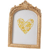 A decorative photo frame from ourMoody Collection displaying an ornate filigree inspired gold color frame in an oval shape with distressed details and antique accents. Frame fits a 3 inch by 4.25 inch photo and can easily be replaced via clips on back. Our Oval Filigree photo frame is easy to display using easel back to free-stand. A vintage home accent perfect for displaying favorite memories as everyday home décor.