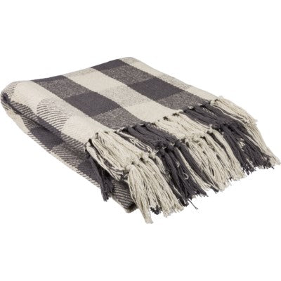 A farmhouse style cotton throw blanket featuring an all-over buffalo check pattern. Features decorative fringed accents. Complements well with other pieces in collection. Machine-washable.