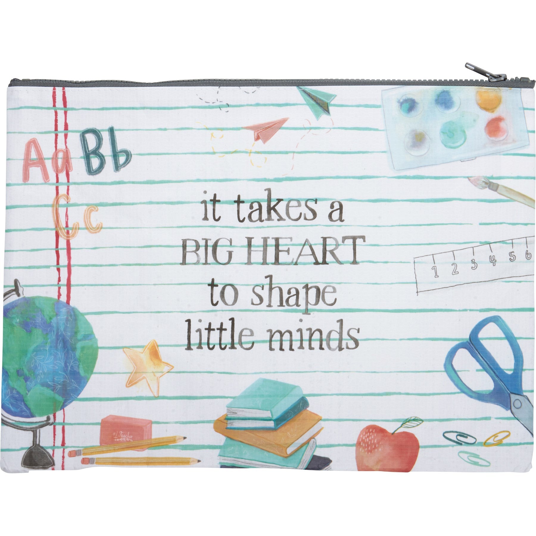 A double-sided zipper folder with sentiment "It Takes A Big Heart To Shape Little Minds." Includes a top zipper closure for easy use. Perfectly sized to hold standard paper documents and folders. Made from post-consumer material.