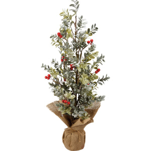 A faux tree featuring eucalyptus leaves berries and a burlap-wrapped base for added interest.