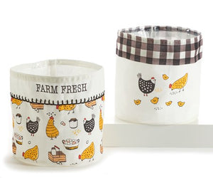 Sort and store anything in this fully lined canvas basket. Organize your pantry or closet with style. Waterproof protection from water damage from plants. Add a trendy decorative element to every room. . Available in 2 assorted designs: All over chicken pattern/FARM FRESH, Chickens/Chicks Pattern,All-Over Bee Pattern, BEE HAPPY.. So attractive and versatile, Store N' More bags are a must for every home and garden!
