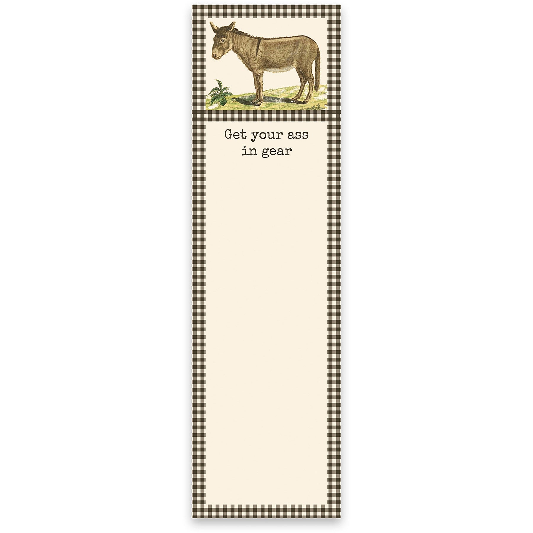 A list notepad from our Farmhouse Collection displaying a vintage design of ducks with green gingham pattern around writing space and punny "Duck Off, Not Today and Get Your Ass In Gear" sentiment. Includes 60 pages and a strong magnet to easily display on magnetic surface.