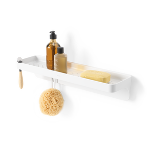 Clearing up counter or shower space, Umbra Flex Adhesive Shelf is a modern bathroom shelf that can be used for all types of storage. Easy to install, Flex Adhesive Shelf includes non-damaging, waterproof adhesive strips that can be applied on various surfaces such as tiles, concrete, etc. (does not work on porous surfaces). With space for bottles or bars of soap, this modern bathroom shelf also has two holes for easy razor storage while its sure-lock grips also double as hooks for loofahs or face towels. Rust-proof and with integrated drainage holes, Flex Adhesive Shelf is designed to provide elevated clutter-free storage that lasts. This easy to use storage shelf measures 16.25 x 4.6 x 3.4" (41 x 11.7 x 8.6 cm) and holds up to 10lbs (4.5 kg). Both damage and tool-free, installation is painless. ♻️ Made from 97% recycled plastic.