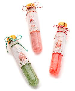 Bath Salts  Take time to refresh and relax after a long day with these sweetly Scented Bath Salts (80 grams) and leave your body feeling cleansed and revitalized. Comes in a glass test tube with festive motifs. Available in 3 assorted holiday scents with sentiments