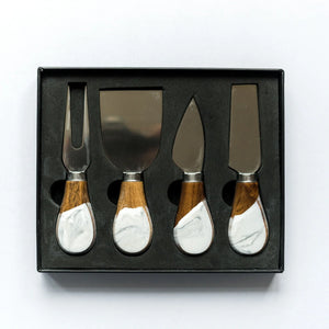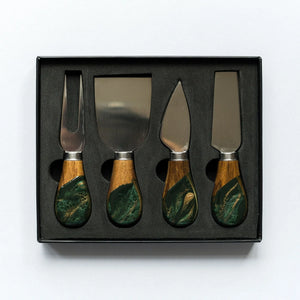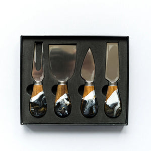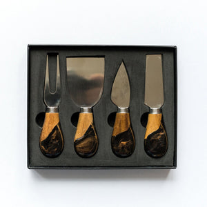 We’ve taken our regular set of cheese knives and elevated them to a whole new level! These beautiful 4-piece sets are made from high quality stainless steel and come with a solid wood handle. Our in-house artists then accent the handles with a gorgeous eco-friendly resin . Each knife is a unique work of art and no two are exactly the same!