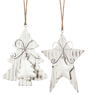 Painted white corrugated metal shapes ornament with layered mini ornament and bow.