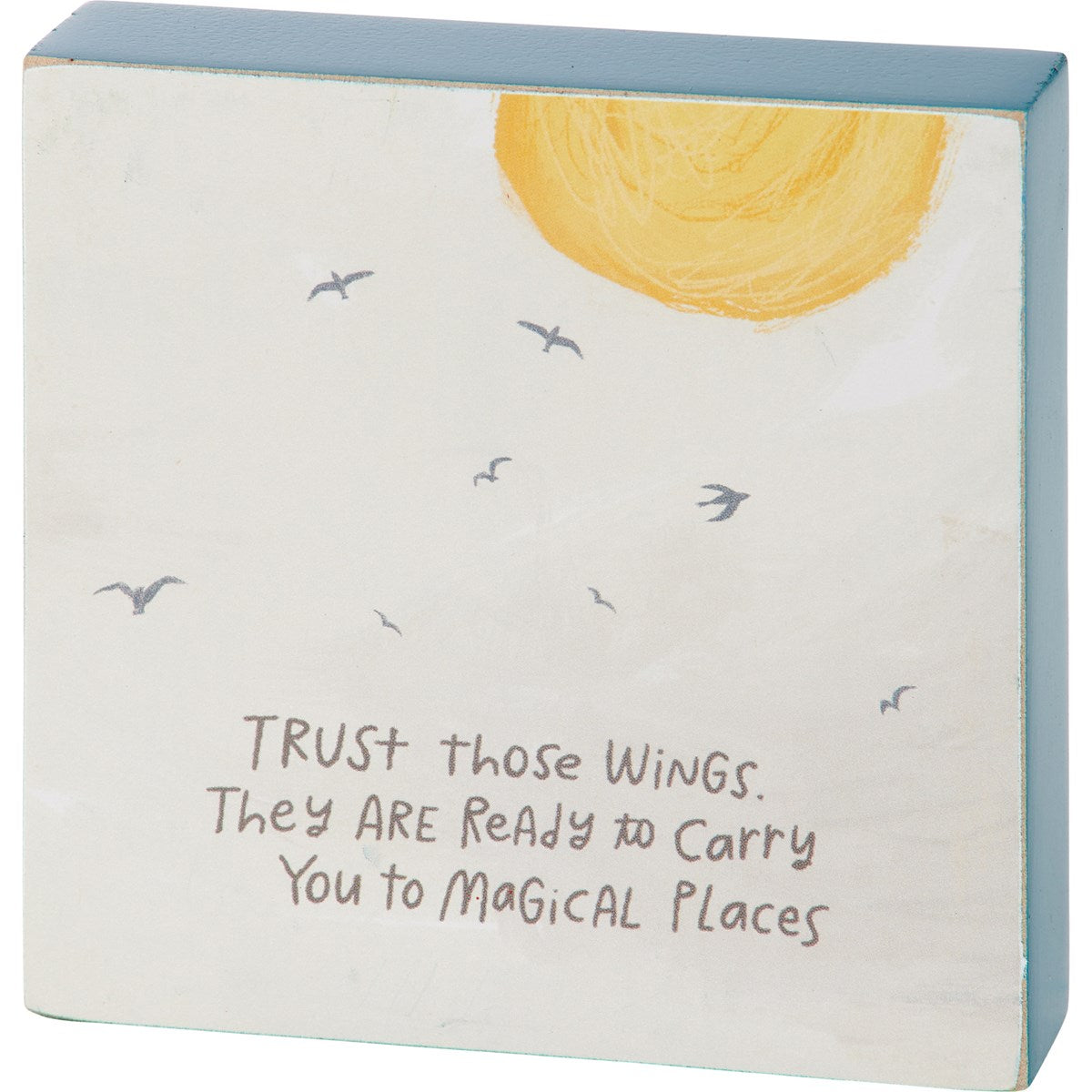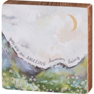 Vivid wooden block signs from Primitives Inspiration & Blooms Collection displaying a calming hand illustrated landscape with an uplifting sentiment that reads Sides and back feature coordinating natural wood. Our block sign are easy to hang via predrilled keyhole slot or can free-stand alone. An inspirational everyday home accent with a variety of display options.