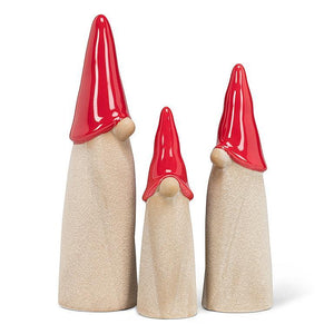 Add some fun to your festive decor with these delightful Red Hat Gnome figurines. This set of three stoneware figurines in different sizes features a uniquely minimalist sculpt of sand-coloured gnomes accented with shiny, pointy hats for an elegant yet eye-catching complement to counters, mantles, decorative displays and more.