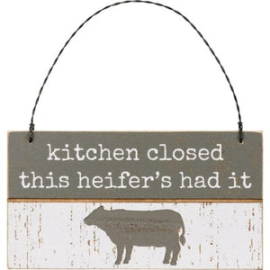 A rustic slat wood ornament featuring a typeset "Kitchen Closed This Heifer's Had It" sentiment and cow design. Our Kitchen Closed This Heifer's Had It ornament easily hangs by twisted wire loop.