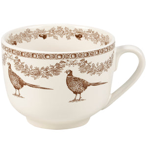 A stoneware 20 oz mug displaying a full wrap-around pattern of pheasants and florals inspired by old world home decor. Mug also features a coordinating design of florals along the inside rim. Microwave oven dishwasher and food safe for easy use.