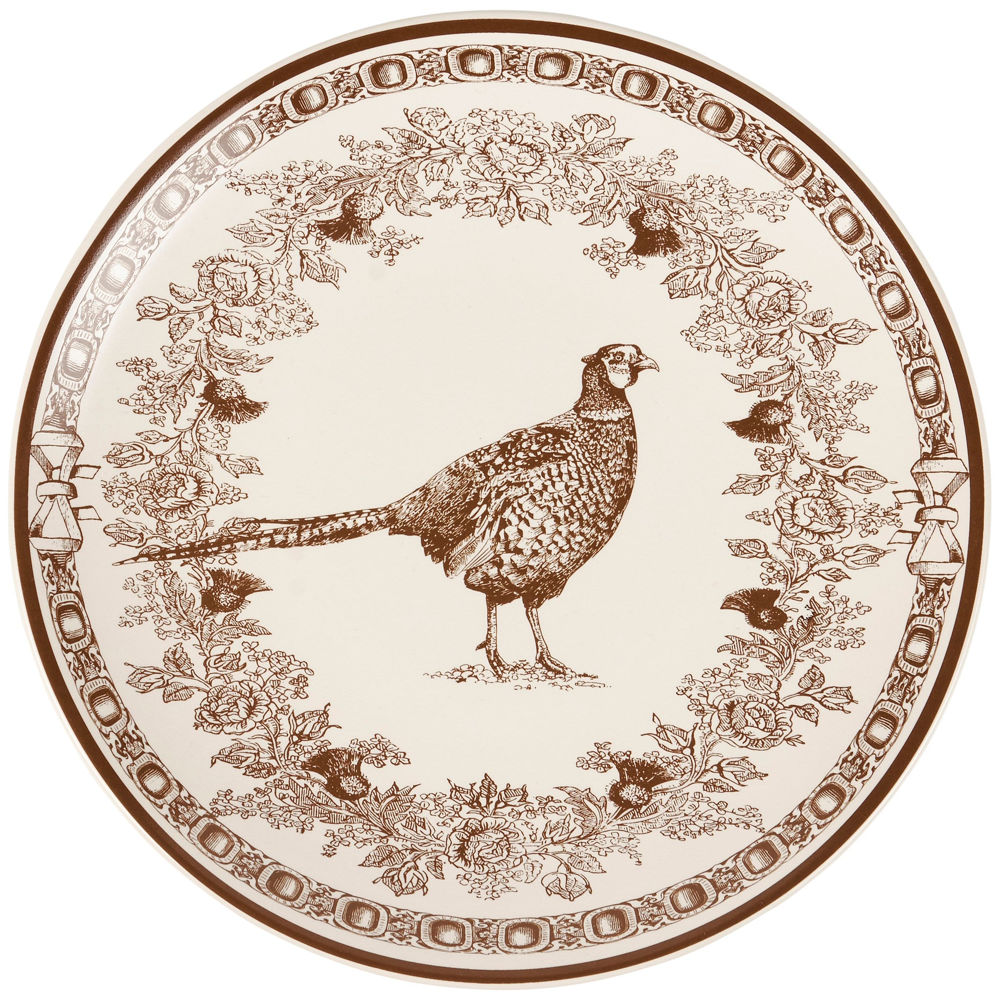 A stoneware plate displaying a pattern of florals surrounding a pheasant design inspired by old world home decor. Plate also features a coordinating pattern along the border. Microwave oven dishwasher and food safe for easy use.