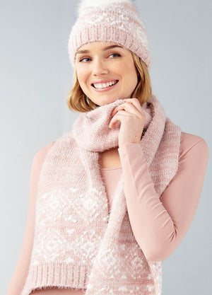 An adorable toque with an oversize faux fur pom and wrap around scarf are made of the softest popcorn and eyelash yarn. This not only looks great, it keeps you warm and cozy outdoors. Available in: Black, Pink, Blue. Hand wash cold, lay flat to dry. 50% Polyester, 27% Acrylic, 23% Nylon.